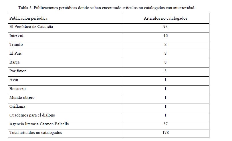 Diversos autores coinciden en la imposibilidad de recopilar todos los artículos publicados de Vázquez Montalbán (Geli y Mauri, 2008; Salgado, 2009), ya que nunca negó un artículo a quien se lo pidiese, pudiéndose hallar escritos suyos en revistas de diferentes asociaciones. De esta forma, se han encontrado un total de 178 artículos no incluidos en ninguno de los dos catálogos periodísticos elaborados hasta el momento, destacando los 93 correspondientes a El Periódico de Cataluña y los 37 localizados en la Agencia Literaria Carmen Balcells (Tabla 5).