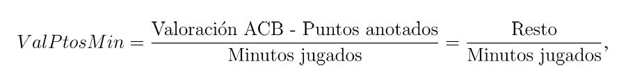De esta forma se elimina la dependencia que tiene la Valoración ACB de los puntos anotados y el posible efecto acumulación debido a jugar un mayor número de minutos. Esta medida es parecida al TENDEX6, índice muy extendido para evaluar el comportamiento de un jugador.