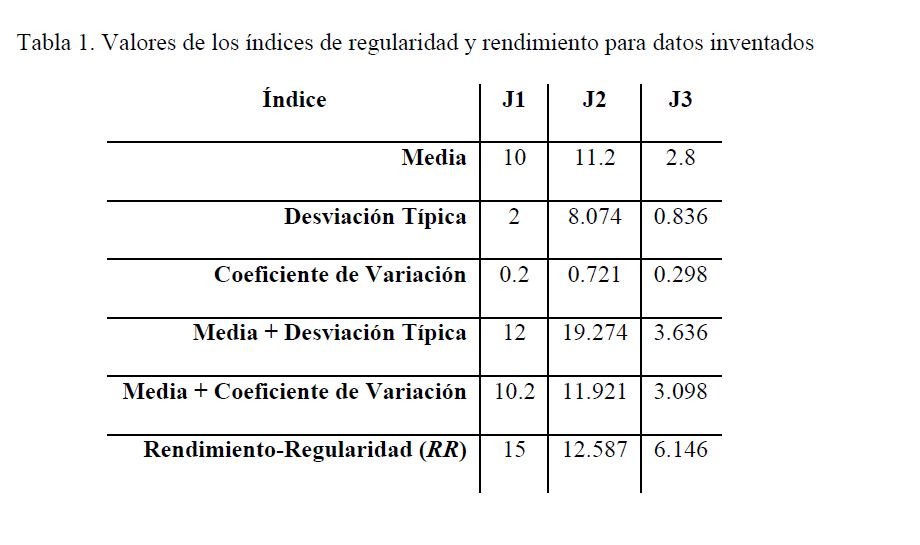 En la Tabla 1 se obtienen los resultados de los índices de regularidad y rendimiento para los tres casos anteriores. Si tenemos en cuenta la media, el segundo jugador es el de mayor rendimiento, mientras que a partir de la desviación típica el más regular es el tercero y a partir del coeficiente de variación sería preferible el primero. Es más, el jugador menos regular es el segundo que es el que tiene mayor rendimiento. ¿Qué jugador es preferible? Parece claro que tomar una decisión exclusivamente a partir de una de las dos dimensiones no es lo más idóneo.
