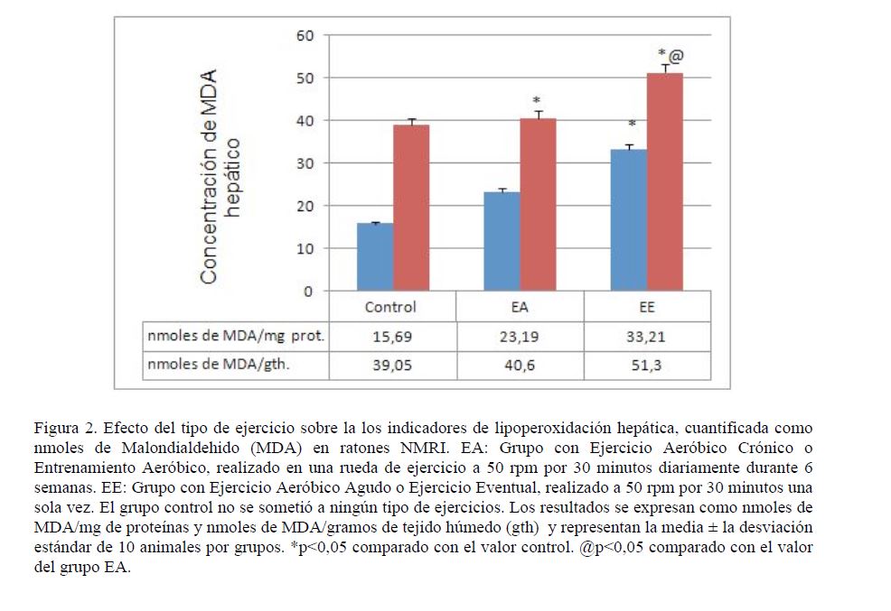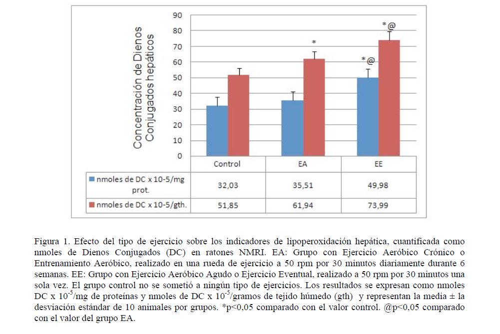 Los resultados de este estudio muestran que los animales sometidos a ejercicio de trote eventual por 30 minutos, presentaron un aumento en la lipoperoxidación hepática cuantificada como nmoles de dienos conjugados y nmoles de MDA, comparados con los animales que se entrenaron el mismo tiempo diariamente durante 6 semanas. Es importante destacar que si bien es cierto que los animales entrenados presentaron una menor lipoperoxidación hepática esta fue mayor que la cuantificada para el grupo control que no fue sometido a ningún tipo de ejercicio, lo que indica que las características del ejercicio podrían potenciar la actividad de fuentes generadoras de EROs. Estos resultados pueden deberse a que durante el ejercicio se incrementa la demanda de energía por los músculos en contracción, situación que promueve el aumento de la producción hepática de glucosa a partir principalmente de la glucogenólisis (solamente entre un 10-20 % es aportada por la gluconeogénesis) (Wahren, Felig, Ahlborg y Jorfeldt, 1991; Wasserman, Williams, Lacy, Green, y Cherrington, 1988). Según Ahlborg y Felig (1982), Kjaer, Engfred, Fernandes, Secher y Galbo (1993), la producción de glucosa hepática aumenta en relación lineal con la intensidad del ejercicio, aumentando dos a tres veces con respecto a su valor de reposo, en ejercicios leves a moderados (menos de 30 minutos) y de siete a diez veces en ejercicios intensos.