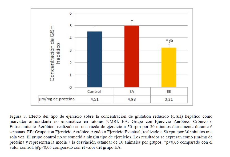 En esta experimentación se encontró que el tipo de ejercicio afecta la concentración hepática de GSH. Este efecto fue antagónico entre los grupos que se ejercitaron con respecto al grupo que no se ejercitó o grupo control, presentando un aumento en su concentración los animales entrenados diariamente 30 minutos por 6 semanas, mientras que los animales que realizaron ejercicio una sola vez y sin entrenamiento previo presentaron una disminución de este antioxidante intracelular.
