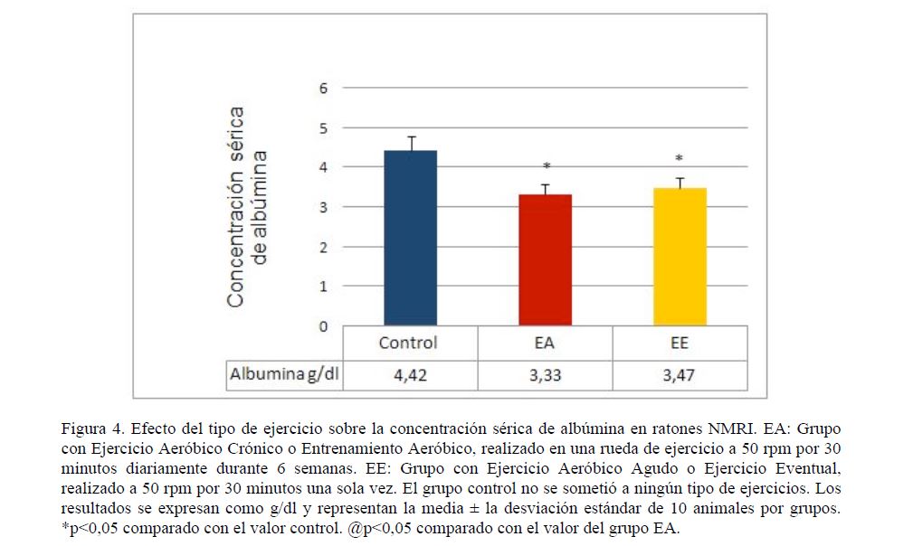 Por otra parte, la concentración sérica de albúmina disminuyó en ambos grupos de animales ejercitados con respecto al grupo control, encontrándose una disminución mas acentuada en el grupo de entrenamiento aeróbico (figura 4).