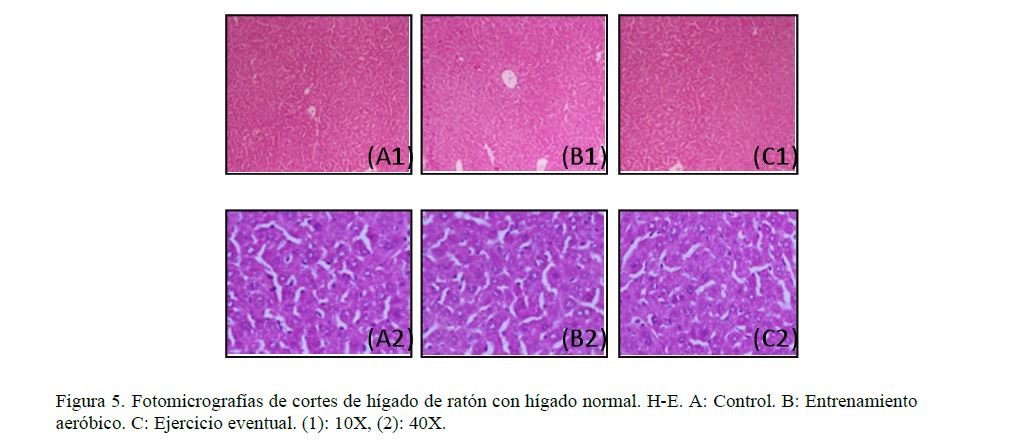 El estudio histopatológico reveló que el entrenamiento aeróbico (ejercicio aeróbico crónico) y el ejercicio aeróbico eventual (sin entrenamiento previo) no alteran la histopatología hepática, ya que las células conservan sus características normales y la arquitectura del parénquima hepático mantiene su uniformidad (Figura 5).