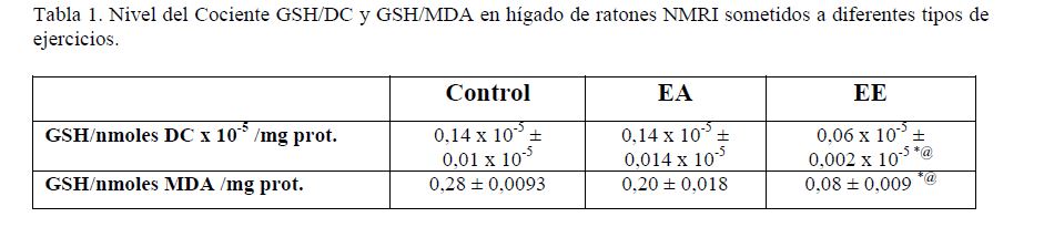 Encontramos que el cociente de la relación GSH/MDA y GSH/DC por mg de proteínas fue menor en los animales sometidos a ejercicio eventual, no encontrándose diferencias significativas entre el grupo control y los animales sometidos a entrenamiento aeróbico (Ver tabla I). Lo que indica que al disminuir el cociente aumenta el estrés oxidativo, presentando por lo tanto un aumento del estrés oxidativo el grupo que realizó ejercicio eventual o una vez sin previo entrenamiento.