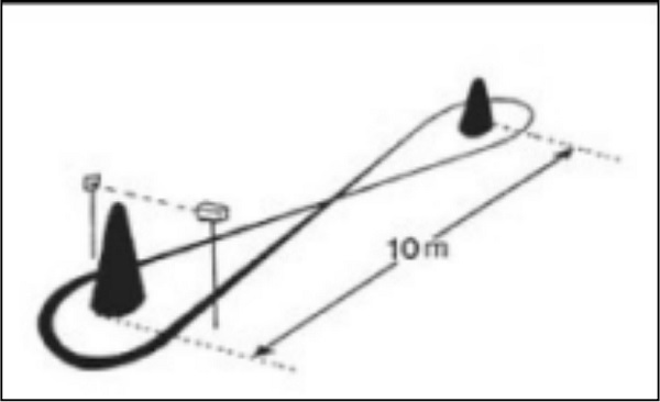Para evaluar el equilibrio dinámico/agilidad se realizó el Figure-of-Eight Run Test, que consiste en recorrer una distancia de 20 metros en un circuito en forma de 8 (Figura 1). Este circuito está delimitado por dos conos separados a una distancia de 10m. La consigna es empezar la prueba cuando se da la señal de salida, correr tan rápido como sea posible alrededor del segundo cono y regresar al primero. Se toma el mejor tiempo de dos intentos. Debido a las características de la muestra el examinador realizó un intento a modo de prueba, andando junto al participante. Para la medida del tiempo se utilizó un cronómetro (ZSD-808). Según el manual del Alpha-Fit Test Battery for Adults, en relación al equilibrio dinámico/agilidad, para el grupo de hombres es considerado un estado de forma bajo aquellas ejecuciones mayores o iguales a 8s, medio las situadas entre 7,0-7,9s y de alto aquellas menores o iguales a 6,9s. En el caso de las mujeres, se estima que un estado de forma bajo se corresponde con ejecuciones mayores o iguales a 9s, un estado medio a aquellas que puntúan entre 8,0 y 8,9s y alto a las inferiores a 7,9s.
