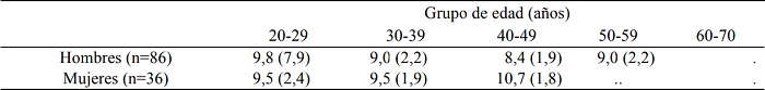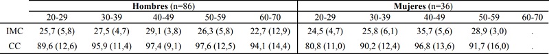 En relación al IMC, es de resaltar que ni los hombres ni las mujeres con DI de ninguno de los grupos de edad presentaron valores relacionados con obesidad. Sin embargo, sólo los hombres más longevos y las mujeres más jóvenes mostraron resultados relacionados con normo-peso, estando el resto en situación de sobrepeso según los valores de la OMS (tabla 3).