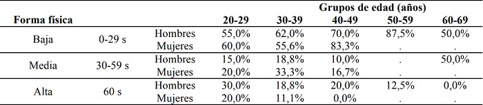 En relación al equilibrio estático, es resaltable que un elevado porcentaje, tanto de hombres como de mujeres con DI de todos los grupos de edad, realizaran ejecuciones relacionadas con una baja condición física. Mientras que en el GR entre el 69% y el 83% de la población más joven (20-29 y 30-39 años, respectivamente) puntúa con buenos resultados, el porcentaje de mujeres con DI de la misma franja de edad con buenos resultados oscila entre el 11% y el 20%. En los grupos más longevos, entre el 33% y el 54% de la población más mayor sin discapacidad obtuvo resultados aceptables (50-59 y 60-69 años, respectivamente), mientras que en el grupo con DI no hubo ninguna participante con buenas puntuaciones a partir de los 40 años. Estos resultados son muy similares en el grupo de hombres y comparables a los encontrados en otros estudios (Cuesta-Vargas y Giné-Garriga, 2014). Las peores ejecuciones de las personas con DI pueden estar basadas en un menor desarrollo de sus capacidades motrices y condicionales durante la juventud que se hacen visibles a lo largo de toda la vida (Enkelaar, Smulders, van SchrojensteinLantman-de Valk, Geurts, y Weerdesteyn, 2012; Enkelaar y col., 2013).