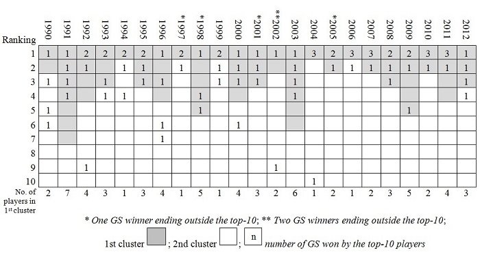 Figure 1 shows the distribution of the end-of-year ranking positions within the first and second top-10 clusters (i.e. higher level top-10 players, lower level top-10 players) and the number of Grand Slams won by the players who finished the season in these positions. In 75.0% of cases (.=69) the players who won one Grand Slam during the season (at least one) finished the year within the higher top-10 ranking positions (i.e. higher level top-10 players; first cluster). In 18.48% of cases (.=17) the players who won one Grand Slam (never more than one) finished the season within the lower top-10 ranking positions (i.e. lower level top-10 players; second cluster). In 6.52% of cases (.=6) the players who won one Grand Slam (never more than one) finished the season outside the top-10. In particular, 45.65% (.=42) of the total Grand Slams under analysis were won by the player ending the year holding the No.1 ranking in the world.