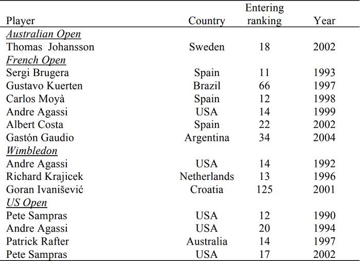 Table 2 shows the players who win the tournament entering outside the top-10 in each of the four Grand Slams (15.22% out of the total winners). In particular, 78.57% of these were among players ranked between the 11th and 20th position of the ATP ranking (i.e. players in the top-20). Only three players won a Grand Slam title entering the tournament outside the top-20: Gastón Gaudio ranked No. 34 in French Open 2004, Gustavo Kuerten ranked No. 66 in French Open 1997, and Goran Ivanišević ranked No. 125 in Wimbledon 2001 as the player who won a men’s singles Grand Slam title with the lowest ranking in the ATP history. There are also other special cases which deserve to be highlighted. This is, for example, the case of Spain and the French Open, in which three players won the tournament entering outside the top-10 (Sergi Bruguera in 1993, Carlos Moyà in 1998, and Albert Costa in 2002). It also highlights the three US Open championships won by US players (country where the tournament is held): Andre Agassi in 1994 and Pete Sampras twice in 1990 and 2002. Also noteworthy is the case of US player Andre Agassi who won three of his eight Grand Slam titles entering the tournament outside the top-10 (Wimbledon in 1992, US Open in 1994, and French Open in 1999). With respect to the temporal distribution of winners entering outside the top-10, 64.28% (.=9) of the total were in the period between 1990 and 2001, compared to 35.72% (.=5) in the period between 2002 and 2012.