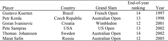 Table 3 shows the players who won a Grand Slam title and finished the season outside the top-10. It highlights the case of three players who won the Australian Open and ended the season outside the top-10: Petr Korda in 1998, Thomas Johansson in 2002, and Marat Safin in 2005.