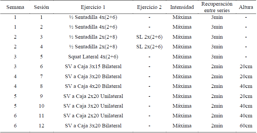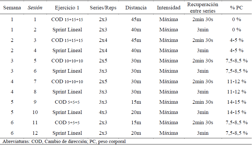 El estudio fue diseñado para comparar el efecto de un programa de entrenamiento neuromuscular con mayor orientación vertical con otro protocolo de entrenamiento neuromuscular con mayor orientación horizontal. Durante el periodo de intervención, los jugadores siguieron participando en su entrenamiento habitual de fútbol. La rutina semanal consistía en 4 sesiones por semana (martes, miércoles, jueves y viernes) con los siguientes contenidos: desarrollo técnico-táctico, entrenamiento de resistencia, entrenamiento de fuerza, prevención de lesiones y trabajo de flexibilidad (70%, 10%, 7%, 6% y 7% del tiempo total de entrenamiento, respectivamente). Además, durante el tiempo que duró el diseño experimental, los jugadores disputaron nueve partidos de competición (domingo). La intervención duró nueve semanas (entre los meses de enero, febrero y marzo, correspondientes al periodo competitivo). La primera semana se destinó a la familiarización de los jugadores con los dispositivos a utilizar y los test a realizar, en la segunda semana los participantes llevaron a cabo las sesiones del pre-test y en la última semana las sesiones del post-test. En ambas jornadas los futbolistas fueron instruidos para realizar su última comida tres horas antes del comienzo de las pruebas, no tomar bebidas con cafeína, ni realizar ejercicio físico intenso el día de la toma de datos (Sánchez-Sánchez, Hernández, Marcos, Rodríguez y Carretero, 2016). Todos los test se realizaron a la misma hora, entre un gimnasio y el campo de hierba artificial donde el equipo realizaba su entrenamiento, con la indumentaria habitual y el calzado que normalmente usaba el jugador. Los test fueron supervisados por los mismos técnicos especialistas en dos días diferentes, con 48 horas de separación entre cada sesión. El primer día de evaluación, además de realizar el registro de las medidas antropométricas de todos los jugadores, se realizaron los test de salto vertical y el test de media sentadilla. En el segundo día se llevó a cabo el test de sprint lineal y sprint con COD. Antes de cada sesión se realizó un calentamiento estandarizado, que consistió en tres minutos de carrera continua a baja intensidad, ejercicios de movilidad articular y acciones de salto y sprint sobre distancias de 10 a 30m. Los programas de entrenamiento tuvieron una duración de seis semanas y consistieron en dos sesiones semanales (martes y jueves), las cuales se realizaron previamente a la sesión de entrenamiento de fútbol. El entrenamiento del GV, consistió en la combinación de ejercicios realizados en un dispositivo inercial con sobrecarga excéntrica (media sentadilla y squat lateral) y ejercicios pliométricos (salto al cajón) (Tabla 1). El entrenamiento del GH, consistió en ejercicios de sprint lineal y COD de 90º (dos cambios de dirección en cada repetición, uno a derecha y otro a izquierda) usando un chaleco lastrado con un incremento de peso progresivo en función del porcentaje del peso corporal de cada jugador (Tabla 2). Ambos programas de entrenamiento neuromuscular fueron administrados en base a parámetros similares de volumen e intensidad. Todos los jugadores realizaron un calentamiento estandarizado previo a la sesión específica de entrenamiento neuromuscular, que consistió en una parte general basada en ejercicios aeróbicos y de movilidad, similar para ambos grupos, y una parte específica, en la que se propuso el ejercicio de ½ sentadilla bilateral, unilateral con cada pierna y bilateral con salto para el GV; y ejercicios de sprint y COD de 90º sobre distancias de 10 a 30m para el GH.