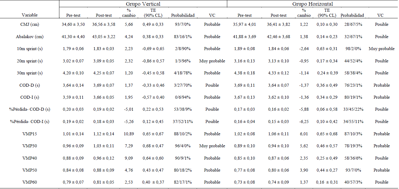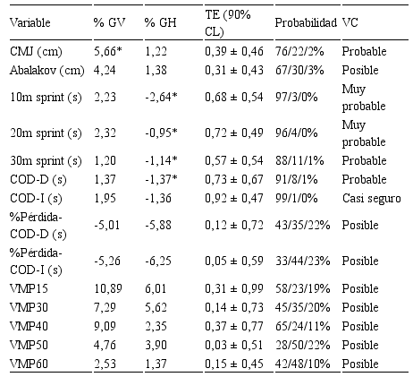 VC: Probable (4/18/78%)] y en el tiempo de sprint con cambio de dirección de 90º hacia la izquierda (COD-I) [0,07s (1,95%), TE = -0,33, VC: Probable (0/6/94%)]. Además, en el GV tuvo lugar un aumento sustancial de la masa corporal [0,84kg (1,27%), TE = 0,14, VC: Probable (89/11/0%)] y del índice de masa corporal [0,27kg/ m² (1,28%), TE = 0,14, VC: Probable (90/10/0%)]. Se encontraron mejoras sustanciales en el GH en el tiempo de sprint en 10m [-0,05s (-2,64%), TE = 0,63, VC: Muy Probable (98/2/0%)], en el tiempo de sprint con cambio de dirección de 90º hacia la derecha (COD-D) [-0,05s (-1,37%), TE = 0,36, VC: Probable (76/23/1%)], en el COD-I [-0,05s (-1,36%), TE = 0,34, VC: Probable (80/19/1%)] y en la VMP en algunas de las cargas utilizadas en ½ sentadilla. El GH no presentó cambios sustanciales en ninguna de las variables antropométricas estudiadas.