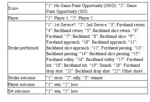 Shots were further coded as: a) service: first serve or second serve; b) return: forehand return, backhand return or backhand slice return; c) groundstroke: forehand, backhand, backhand slice, forehand approach, backhand approach, backhand slice approach, forehand passing shot, backhand passing shot, backhand slice passing shot, forehand lob, backhand lob, smash, forehand drop shot, backhand drop shot or other shots; d) net shot: forehand volley or backhand volley.