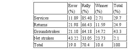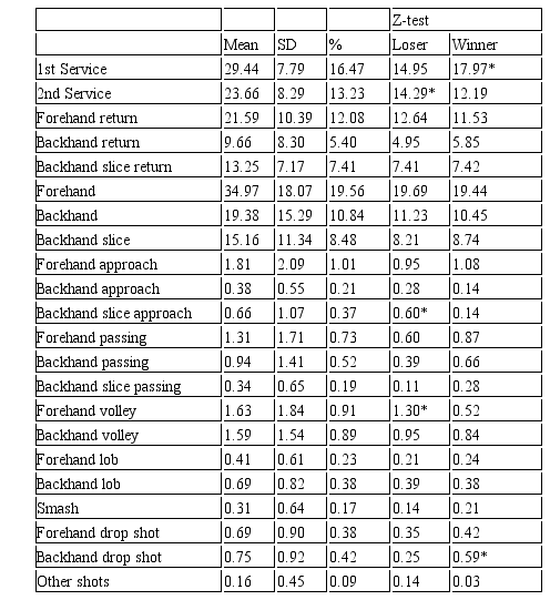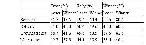 Table 3 shows the differences between winning and losing players with respect to shot outcomes. Winning players made fewer errors than losing players on services, returns, groundstrokes and net strokes. They also made more winning shots on services, returns and groundstrokes. The greatest difference between winning and losing players was with respect to winning services (80.4% vs. 19.6% respectively).