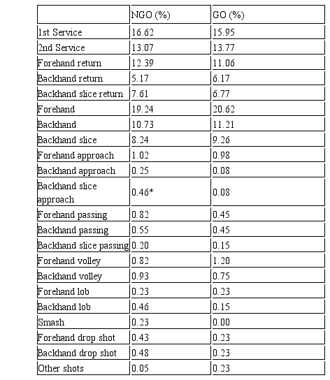Table 4 compares the distribution of strokes on non-game point opportunities (NGOs) and game point opportunities (GOs). The only difference is in use of backhand slice approaches, which were more frequent on NGOs than GOs (.<0.05).