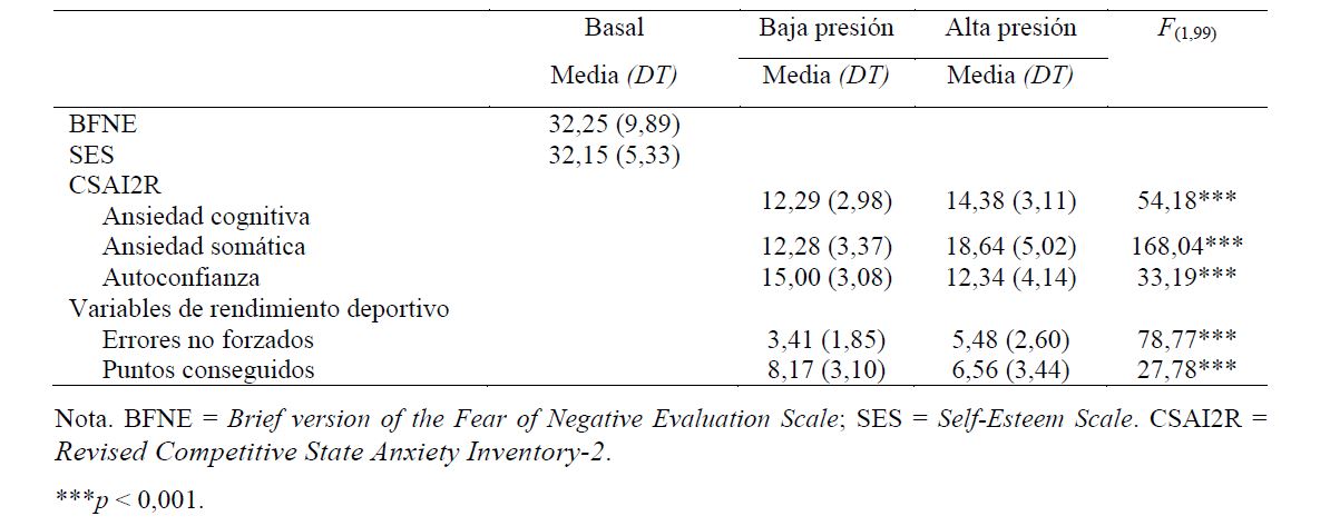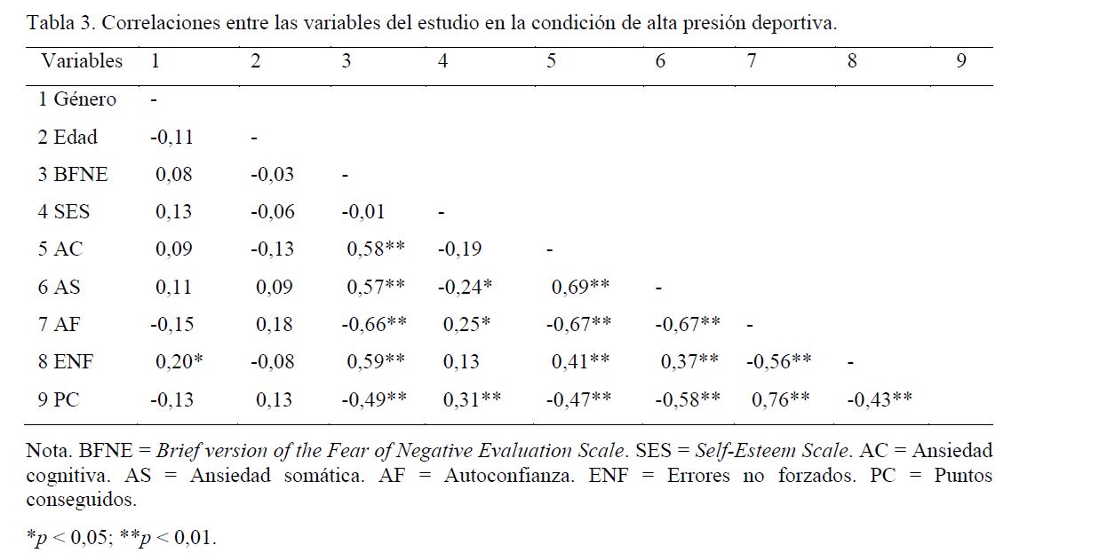 En contraste con las bajas o inexistentes correlaciones observadas para la fase de baja presión, encontramos que tanto las variables negativas (miedo a la evaluación negativa, ansiedad cognitiva, y ansiedad somática) como las variables positivas (autoestima y autoconfianza) correlacionaron de forma significativa con el rendimiento deportivo, con valores entre moderados y altos. La única excepción fue la ausencia de correlación entre autoestima y la variable de rendimiento errores no forzados (Véase la Tabla 3).