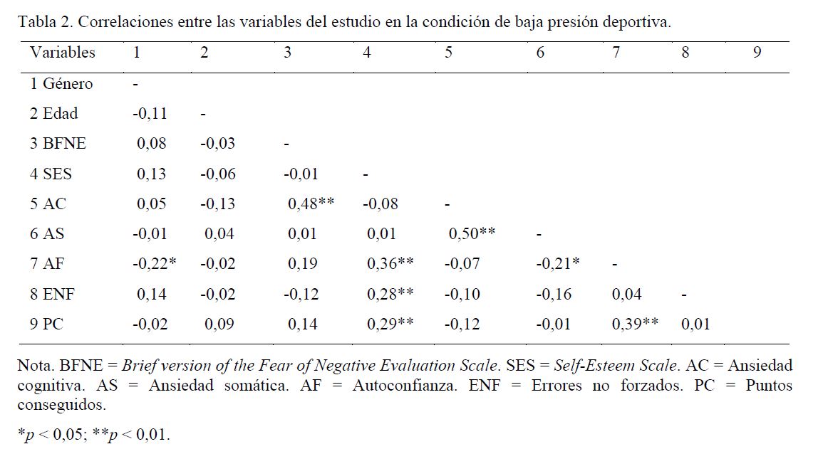 En la Tabla 2 se presentan las correlaciones entre todas las variables del estudio (i.e., variables de diferencias individuales, variables de estados emocionales, y variables de rendimiento deportivo), referidas a la condición de baja presión. Cabe destacar que las variables de ansiedad no correlacionan con ninguna de las variables de rendimiento deportivo. En cambio, sí encontramos correlaciones significativas entre las variables de tipo positivo (autoestima y autoconfianza) y las variables de rendimiento (véase la Tabla 2)
