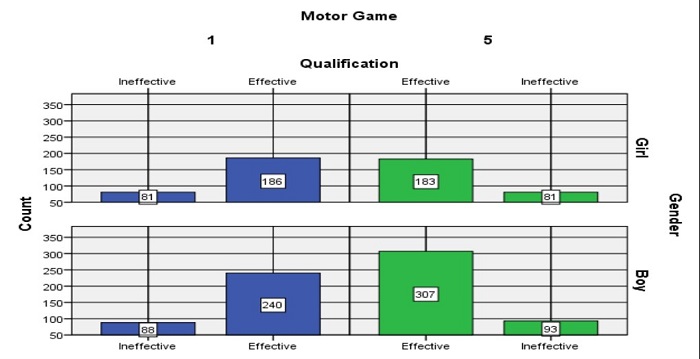 a) Determining motor behaviour quality (effective and ineffective) of players (girls and boys) when practicing two motor games (1 and 5).