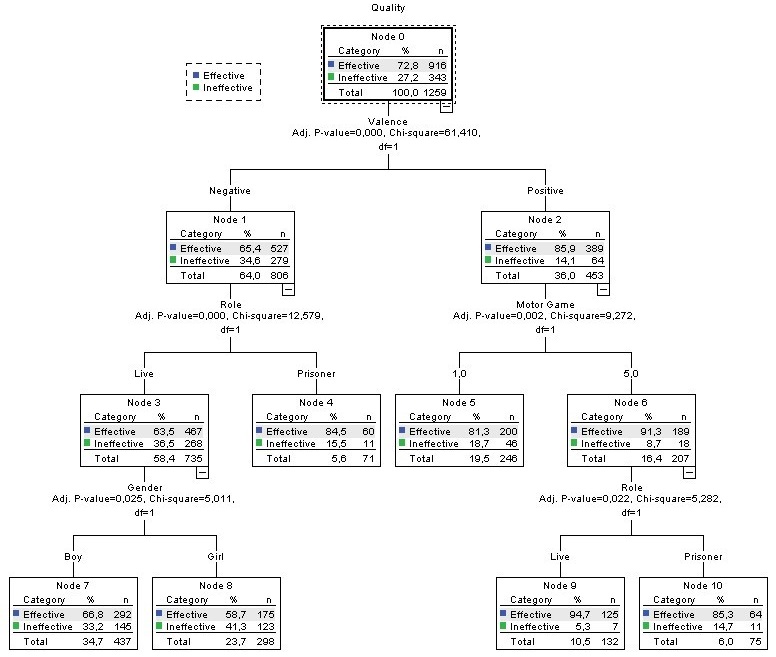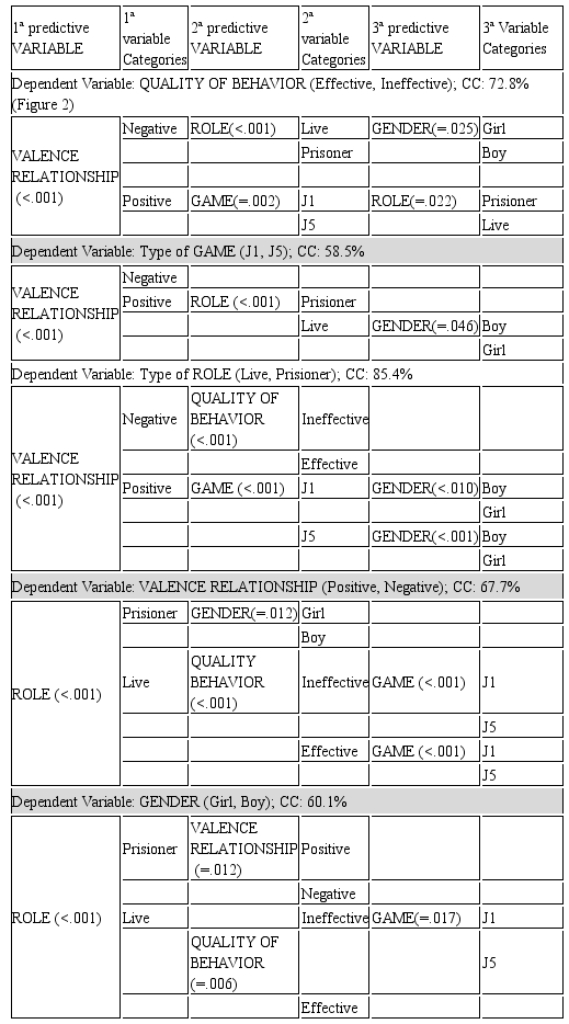 The valence of the relationship was the first predictive variable (independent variable = IV) (<.001) to be considered in three of the five decision trees to explain the variables (dependent variables = DV): quality of behavior (CC: 72.8 %), the type of game (CC: 58.5%) and the type of role (CC: 85%). It was also the second variable with the strongest predictive power to explain the behavior according to the gender of the protagonists. When it comes to explaining the main variables to be considered in ineffective motor behaviors, the first predictive variable was the negative valence of the motor relations (opposition relation) that had a greater presence in the live role and especially when they were carried out by the girls’ ineffective behaviors were more present in game J1 than in game J5.