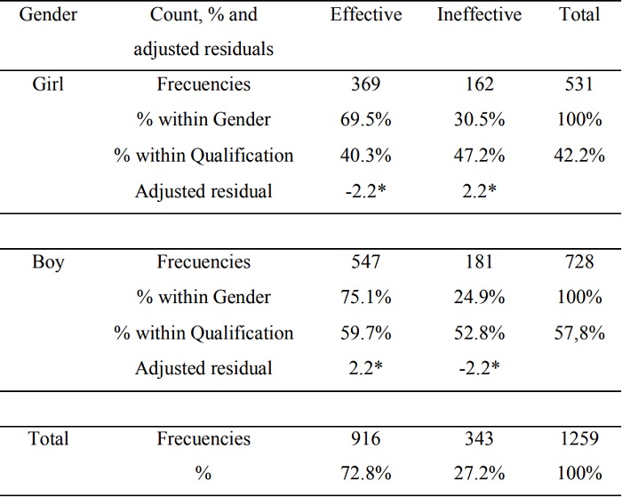 In Table 1, there was a higher participation of boys (n = 728, 57.8%) over girls (n = 531, 42.2%). It was also observed that in both boys and girls there were significant differences (p =.026) in the type of motor behavior, so that there was a higher percentage of effective behaviors (n = 916, 72.8%) than ineffective (n = 343, 27.2%). However, when comparing the proportional values within each gender, it was evident that while the boys tripled the margins of effectiveness with respect to the ineffectiveness, the girls were closer to double them.