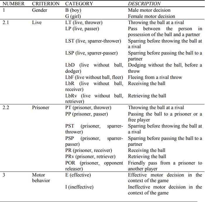 Lince software (Gabin, Camerino, Anguera & Castañer, 2012) was used to design an observational 'ad hoc' tool that allowed to record the motor actions of the players. The instrument combined the characteristics of the category system and the field format. The tool consisted of 19 categories, mutually exclusive (Anguera, 1991), grouped into 3 criteria: a) boy or girl; b) live or prisoner role; c) effective or ineffective actions of the motor behavior. A description of the categories was prepared (Annex 1) to facilitate their understanding. As an example, if a player (G) using the role Live (LT), makes a failed throw (I) but the ball does not reach its destination, it would correspond to the record G(girl)-LT (live, thrower)-I (ineffective).