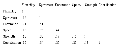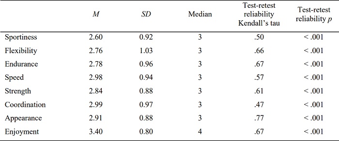 Spearman-correlations (rho or ρ) showed significant negative correlations between age and flexibility (p = -.37), general sportiness (p = -.11), endurance (p = -.27), and the overall factor (p = -.36). Also, sport enjoyment was positively related to all items (.13 < τ <.48). Furthermore, the relationship between enjoyment and composite physical self-concept was τ = .45 (p < .001), which can be interpreted as a convergent validity estimation.
