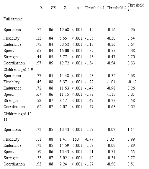 On the measurement model level, a one-dimensional latent variable was assumed. Physical appearance as the second domain of physical self-concept was not considered in the present measurement model as it does not belong to the fitness dimension. Sport enjoyment is not considered to be part of physical self-concept, rather, it is considered to be an outcome or related variable. Therefore, a one-factor confirmatory factor analysis (CFA) was conducted to test the assumed one-dimensional model that is measured by the items strength, endurance, speed, coordination, flexibility and general sportiness as these items describe the hypothesised physical fitness domain according to the theoretical model of Shavelson et al. (1976). The diagonally weighted least square estimator specifically designed for ordinal data and a scaled test statistic was used. Latent factors were standardised, allowing free estimation of all factor loadings (see https://osf.io/pg4fy/?view_only=a77df7f94e0e460b8dc4b7489aaef2da for open code and the exact model specifications). Within the CFA, probabilistic scale usage of participants was investigated by modeling threshold parameters between each response category for each item. Threshold analysis was conducted in order to check the assumed ordinal structure of the scale. Further, considering the present sample consisted of participants in a wide age range, the question of whether physical self-concept differentiates across childhood was conducted by testing measurement invariance for children younger than 10 years and children aging 10 years or older. Further, measurement invariance was examined for gender. Evaluation of CFA model fit was guided by criteria proposed by Hu and Bentler, (1999; CFI > .90, TLI > .90; RMSEA < .06, SRMR < .08). As Harter (1982), Dreiskämper et al. (2015) and Tietjens et al. (2018) found in childhood, physical self-concept is influenced by gender and age, with boys rating themselves higher than girls in all the single items except flexibility, and older children showing lower physical self-concept levels. Therefore, differences according to gender and whether there is a negative correlation between age and physical self-concept evaluations, will be tested using Student .-tests and Spearman correlations, respectively (. < .05).