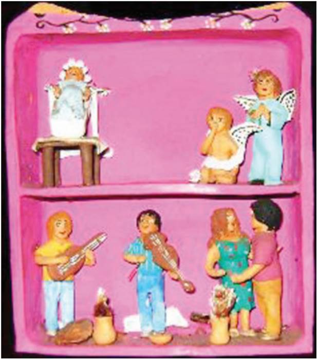 Al entrar a la sala de la casa donde se llevaba a cabo la ceremonia, contemplamos la escena: sobre una mesa, sentada en una sillita, habían colocado el cuerpo de la niña muerta de tres años de edad, vestida toda de blanco y con una corona en la cabeza. De su espaldita, sobresalían unas alitas blancas adornadas con cintas rosadas. Estaba rodeada de flores, globos de colores e iluminada por dos cirios. Acompañaban el lugar muchas personas que entraban y salían permanentemente del recinto. En un rincón junto a la urna vacía, cuatro músicos cantaban romances y otras melodías muy tristes, acompañados por un cuatro, dos guitarras y un violín, es decir, instrumentos musicales cordófonos. El cultor Darío Mercado, presente en este velorio de Angelito, expresó: