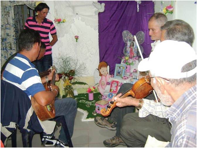 Cuando ellos fallecían [los niños], los preparaban bien como en una sillita y... después sí (...) les colocaban sus alitas... Durante eso pues antonces uno estaba tocando y los demás preparando el ángel ahí al frente, tocando y cantando... Lo tenían todo el día, como dicir, si moría hoy en la mañana, hoy todo el día y la noche, la noche hasta el otro día que se le daba sepultura. Lo sacaban del campo hasta el pueblo, cuando había la posibilidad, con música todo el camino... hasta que llegaba uno al pueblo. Tocábamos un rato y de ay descansábamos y seguíamos tocando. Llegaba uno al pueblo y antonces lo mismo, se velaba un rato, se colocaba en una posada por ahí mientras se abría la sepultura pues, antonces durante ese rato uno seguía tocando y después se llevaba con música hasta el cimenterio y se le daba sepultura (conversación en fecha 10 de enero de 2011).