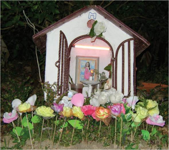 Luego de estos cánticos, los familiares de la niña muerta ofrecieron sendos platos de comida a los presentes y exhibieron una gran torta decorada con motivos infantiles, dulces y refrescos. Al finalizar, compartieron esta torta, entregaron juguetes a los niños invitados que corrían y jugaban por el patio de la casa. Allí, en el patio, observamos una pequeña capilla iluminada, también dedicada a la difunta festejada.