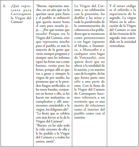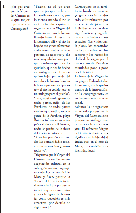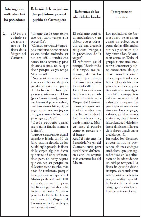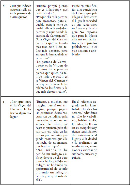 Los rituales de la conmemoración a la Virgen del Carmen permiten la reafirmación de las identidades locales de los pobladores de Carrasquero. En estos ritos los individuos se comportan conforme a esquemas de representaciones colectivas que les integran y cohesionan. En el cuadro hemos recogido los discursos de los/las interlocutores de Carrasquero para revisar sus contenidos e identificar el referente cuando hablan de sí mismos, no los citaremos todos por razón de espacio sino que seleccionamos los discursos comunes y cuando no coinciden hemos dado a conocer las dos versiones. En la primera columna están las preguntas que se les hicieron, luego cómo expresan la relación con la virgen, en la tercera columna cuando el discurso es referente de identidades locales y finalmente, nuestra interpretación.