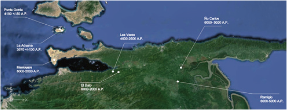 La evidencia paleo ambiental sugiere que los primeros hombres conocieron una isla muy distinta a la actual de suelos áridos, vegetación xerofítica y sin agua potable. Hace 4.000 años, el mar se encontraba 7 metros por debajo del nivel actual, las costas eran más amplias, en ellas ocurría tal como hoy, la vida. Con el paso de los milenios el proceso se invirtió, subió el nivel de los mares, las islas bajaron y se desvanecieron las huellas dejadas por los primeros hombres (van Andel 1.954; Miró Orell, 1.974; Sanoja 1.989)