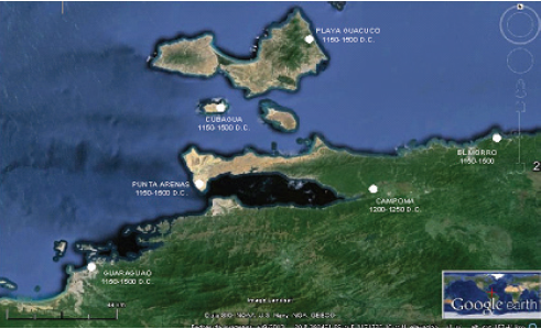 El material recuperado se caracterizó por poseer engobe rojo sobre pintura blanca y estar asociado a lascas de cuarzo y partes de Strombus gigas. Este estilo cerámico es similar a los estilos Punta Arenas del Estado Sucre y Guaraguao del Estado Anzoátegui, pertenecientes al Periodo IV de la Cronología de Cruxent & Rouse, y fechados entre 450 y 800 A.P. Otra de las localidades de importancia para comprender los distintos paisajes regionales que pudieron estar asociados a Cubagua es la Laguna de Campoma, ubicada en el Estado Sucre, lugar en el que las investigaciones arqueológicas documentaron la existencia de un área que sirvió de asentamiento y también para explotación de recursos, contemporánea a las estaciones cerámicas de Playa Guacuco en Margarita, La Aduana en Cubagua, Punta Arenas en el Estado Sucre y Guaraguao del Estado Anzoátegui, todas relacionadas con la serie Dabajuroide del Estado Falcón (Wagner, 1977).