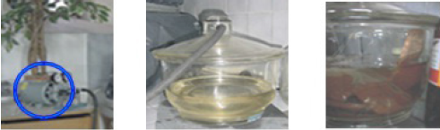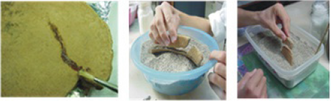 Los fragmentos decorados de la pieza se sometieron a otro método. Debido a la dureza de su pasta, se sumergieron en una olla con agua destilada y se colocaron sobre una estufa encendida hasta que el agua alcanzó los 60°C continuos, allí se mantuvieron por varios minutos mientras se medía la temperatura con un termómetro, posteriormente se apartó la olla de la estufa y se dejó en reposo por tres horas aproximadamente; (El mismo proceso se efectuó cuatro veces). Como consecuencia de lo anteriormente expuesto, podemos concluir que la estabilización de las sales solubles es el proceso de conservación más importante para detener el estado degenerativo de la obra u objeto cerámico.