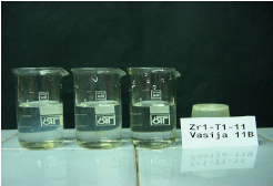 Esta experiencia consistió en sumergir un fragmento de la vasija en un recipiente con agua destilada dejándolo reposar por un tiempo de 16 horas, luego se sacó el fragmento, se vertió el agua del envase en un vaso precipitado y —en otros dos vasos que sirvieron de testigos o certificadores— se agregó, en uno agua corriente y en otro agua destilada para un total de tres vasos. A cada vaso se le colocó tres gotas de nitrato de plata al 0,1N pues, si el vaso que contiene agua de la vasija alcanza, después de siete segundos aproximadamente, una nubosidad color azul, podemos inferir que hay presencia de sales solubles o de cloruros de sodio en la pieza; los otros dos vasos sirvieron simplemente como testigos, el de agua corriente presento una leve nubosidad y el de agua destilada no mostro nada. Esta prueba dio positiva a la presencia de cloruros de sodio o sales solubles, lo que nos permitió determinar otro paso mas a utilizar en la metodología de intervención.