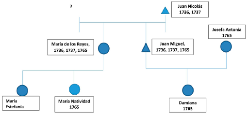 Al mismo tiempo se habría alcanzado otro resultado interesante en base al estudio de estos tres listados, al notarse la presencia de un pequeño grupo familiar identificado así en tres generaciones. Efectivamente, obsérvese en la lista de 1765 a las hermanas María Estefanía y María Natividad, y a su prima Damiana, quienes en ese momento serían menores de diez años (debido a la indicación de párvulas –p-). Las dos primeras eran hijas de María de los Reyes y la última de Juan Miguel, y siendo éstos a su vez hermanos e hijos de Juan Nicolás (viudo según inventario de 1736), las tres: María Estefanía, María Natividad y Damiana, eran efectivamente primas y a su vez nietas de Juan Nicolás, por lo cual se puede componer ya una pequeña graficación de paren tesco. No obstante y lamentablemente, en los inventarios y matrículas que siguen no ha sido posible encontrar pista alguna que permita conocer la continuidad de esta familia en San Faustino.