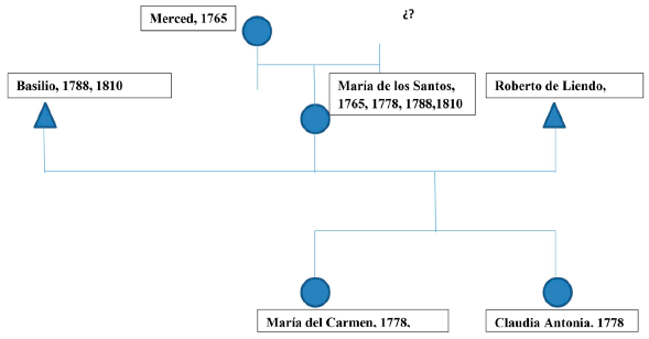 Los años que aparecen junto a los nombres del anterior gráfico, corresponden a los años en que fueron realizados los inventarios de San Faustino (1736, 1737) y la matrícula parroquial (1765), fuentes documentales en base a las cuales se ha logrado realizar este breve resumen de parentesco.