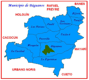 El municipio Báguanos se encuentra situado al centro- noroeste de la provincia de Holguín, en la República de Cuba. Es una extensa llanura bordeada por la Sierra de Nipe y el grupo Maniabón. Limita al norte con los municipios Freyre y Banes, al sur con los municipios Cueto y Urbano Noris, al este con el municipio Mayarí y al oeste con los municipios Holguín y Cacocúm. Cuenta con dos centrales azucareros y se divide en 11 consejos populares: La Esperanza, Tacámara, La Caridad, Los Haticos, El Manguito, Potrerillo, Tacajó, Alcalá, San Jerónimo, Bijarú, Unión 6 y Báguanos, cabecera municipal donde se realizó la investigación.