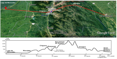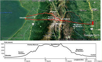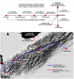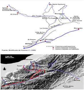 En primer lugar, Mérida se comunicaba con Tucaní (pueblo de encomienda) y Gibraltar por el valle longitudinal del río Mucujún, que se conectaba con el valle transversal del río Tucaní, en un recorrido total de unas 30 leguas, equivalente a unos 150 kilómetros, tal como lo señalan Vila (1978) y Kauman (1985, en Niño, 1990) (Figuras 3 y 4).