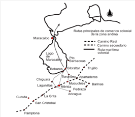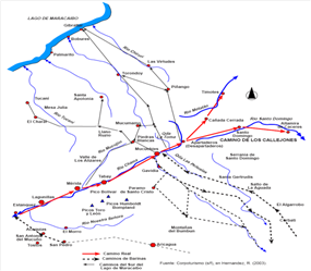 La diversificación económica colonial va a tener entre una de sus consecuencias el auge de una gran actividad comercial por el Camino Real, que no se limitará al ámbito local, en el caso de la subcuenca alta del río Chama, sino al nivel de todos Los Andes venezolanos y parte de la región andina colombiana. El Camino Real llegó a ser una especie de gran camino interandino entre el territorio colombiano y el territorio venezolano, abarcando desde Santa Fe de Bogotá, hasta el actual Estado Trujillo, cuyo trazado básico estaba claramente determinado por las abras de valles longitudinales ubicados en la cordillera oriental colombiana y en la cordillera merideña (Figura 2).