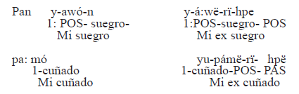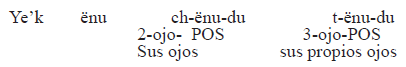 Lo anterior se puede observar en la Tabla 9, los ejemplos i al ix. En otras lenguas amerindias se haya el mismo fenómeno como lo expuso Mithun (2001) en su análisis de las lenguas amerindias del noroeste de Estados Unidos, Lakhota, Katthlamet y Mohawk. Mithun muestra que hay diferencia del poseído de acuerdo a la clasificación del nombre en inalienable, alienable o de acuerdo a la relación espacial del objeto.