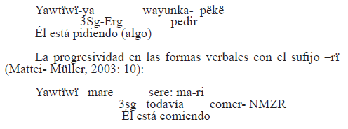 En ye’kwana, existe la postposición hëkë… pero no se emplea para la forma progresiva. En esta lengua es el sintagma adverbial verbo + he (-pe en las demás lenguas que prevalece la progresividad).