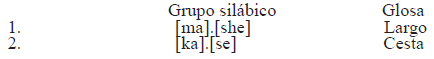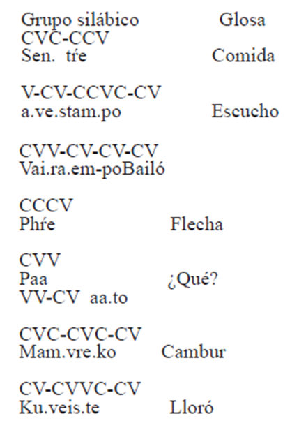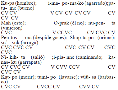 Al respecto, Oquendo, Morales y otros (2007) expusimos que la composición silábica yukpa presenta los siguientes grupos silábicos con un alto grado de frecuencia, fenómeno que es una piedra angular para analizar el proto, VC, CV, V; aunque también tiene otros como: CVC, CVV, CVCC, CVC. Veamos algunos ejemplos: