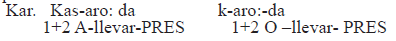 Mattei- Müller (2003) refiere los cambios fonológicos en cuanto a los prefijos del dual se han mantenido en Kariña, pero que han desaparecido en Mapoyo y Yawarana como en los ejem- plos que nos muestra: