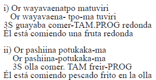 Chavier y Oquendo (2002) con respecto al yukpa, señalan al sufijo – Mak como marca de progresividad, no obstante, “… es una unidad polisémica y polifuncional puesto que recoge los significados de tiempo, aspecto y concordancia; y puede sufijarse a verbos, nombres adjetivos y adverbios” (2002: 135). No siempre aparece la representación –Mak, algunas veces va seguido de la vocal media posterior y, otras veces se omite la oclusiva velar /k/. Este fenómeno se da por los entornos fonológicos el cual más adelante vamos a explicar.