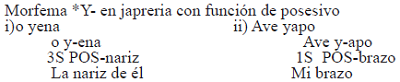 ¿Qué ocurre en la lengua japreria? Gildea (1998) plantea que la partícula *Y referida por este autor como prefijo del nombre poseído de las formas posesivas en algunas lenguas caribes y, este fenómeno es reflejo del Proto-Caribe. Sin embargo, para que se dé, deben cumplirse algunas reglas morfosintácticas: el orden de palabras, el orden de los constituyentes y, sí el verbo es transitivo o intransitivo. Oquendo (2007: 171) revisé esta hipótesis en la lengua japreria, siguiendo a Gildea (1998), y llegué a las siguientes conclusiones: