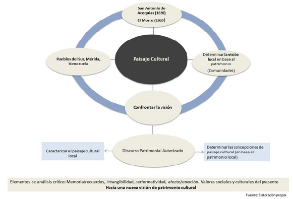 En sintonía con los autores trabajados, y desde diversas posturas interdisciplinarias, nos conduce como investigadores a comprender la idea del patrimonio y paisaje cultural más allá de una simple “cosa” y entender la relación entre proceso social y cultural para asumir una perspectiva crítica y analítica, además de tomar partido de los conceptos que van a regir la investigación con el propósito de estructurar los temas de memoria y recuerdos, intangibilidad, identidad, performatividad, afecto y emoción; que nos permita explorar diferentes aspectos de los usos del patrimonio, estos serán llevados al trabajo de campo con la finalidad de construir un discurso patrimonial local, en la interpretación del paisaje cultural de los Pueblos del Sur en Mérida, Venezuela.