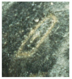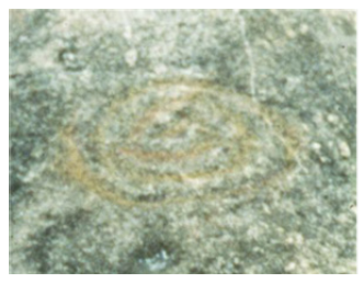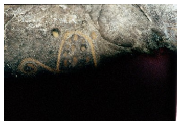 14. Otra de las lajas importantes para este sistema religioso es la de las pinturas de Ámarru (Amarru-idáki). En su superficie se encuentran importantes petroglifos que representan: a) su fallido primer sexo (Figura 10)9, b) su sexo definitivo (Ámarruishi) (Figura 11), c) sus pinturas faciales y d) las tres trompetas ancestrales o sus hijas.
