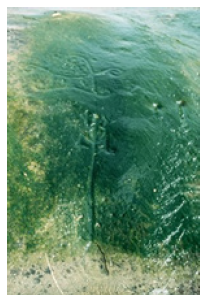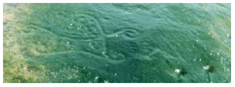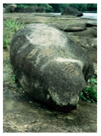 12. Volviendo hacia la orilla del poblado, pero aún en el agua y cubierta por el limo, se encuentra una piedra con un petroglifo que presenta uno de los motivos que más se repiten en los lugares sagrados Maipure. Se trata de la figura de lpéku o lpéku- ka-kúwai (mono cara rayada), uno de los hijos de Iñápirrikuli6.