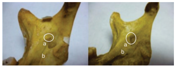 En relación a los detalles anatómicos propios de la cara interna de la rama mandibular, no se presentó diferencia estadísticamente significativa entre las dos poblaciones estudiadas (Ver tabla 2), no obstante; en cuanto a la morfología de ciertos detalles y las distancias establecidas, existieron variantes entre los diversos individuos que conformaban las muestras intrapoblacionales, así como diferencias entre lado derecho e izquierdo. Específicamente, desde el punto de vista morfológico en el caso de la espina mandibular, en las muestras procedentes de Mucuchíes, el patrón que se reporta con mayor frecuencia para el lado derecho fue el atenuamiento (08 casos: 33, 3%), difiriendo del lado izquierdo, donde se presenta desarrollo (09 casos: 37,5%) (ver figura 2).